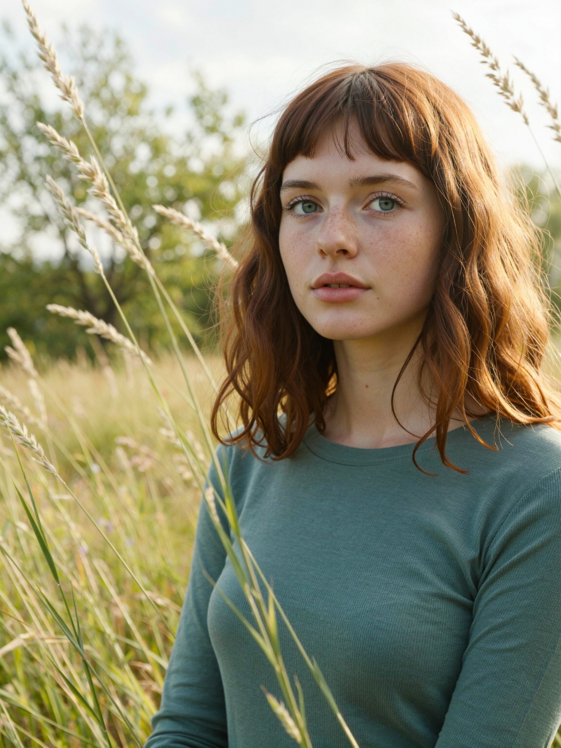 ? Grooming: Her hair is styled naturally, with a slight wave and visible texture. Her bangs are straight-cut and fall just above her eyebrows. | Enhanced Prompt: A young adult female subject, approximately 18-25, with fair skin, visible freckles across her nose and cheeks, and striking blue-green eyes, gazes contemplatively directly towards the viewer. She has shoulder-length, wavy auburn hair with straight-cut bangs. She is wearing a long-sleeved shirt made of a muted, desaturated teal, fine ribbed knit fabric. The scene is a sunlit field of tall grasses that dominate the foreground, acting as natural framing elements leading toward the subject positioned slightly off-center to the right. The background environment is softly blurred with creamy, smooth bokeh, suggesting late afternoon natural lighting. The aesthetic features a subtle, fine film grain for an organic texture, achieved with a sharp focus on the face using a prime lens (50mm-85mm range) and a very shallow depth of field (f/2.8-f/4). Photorealistic, serene, high detail. SHOT: