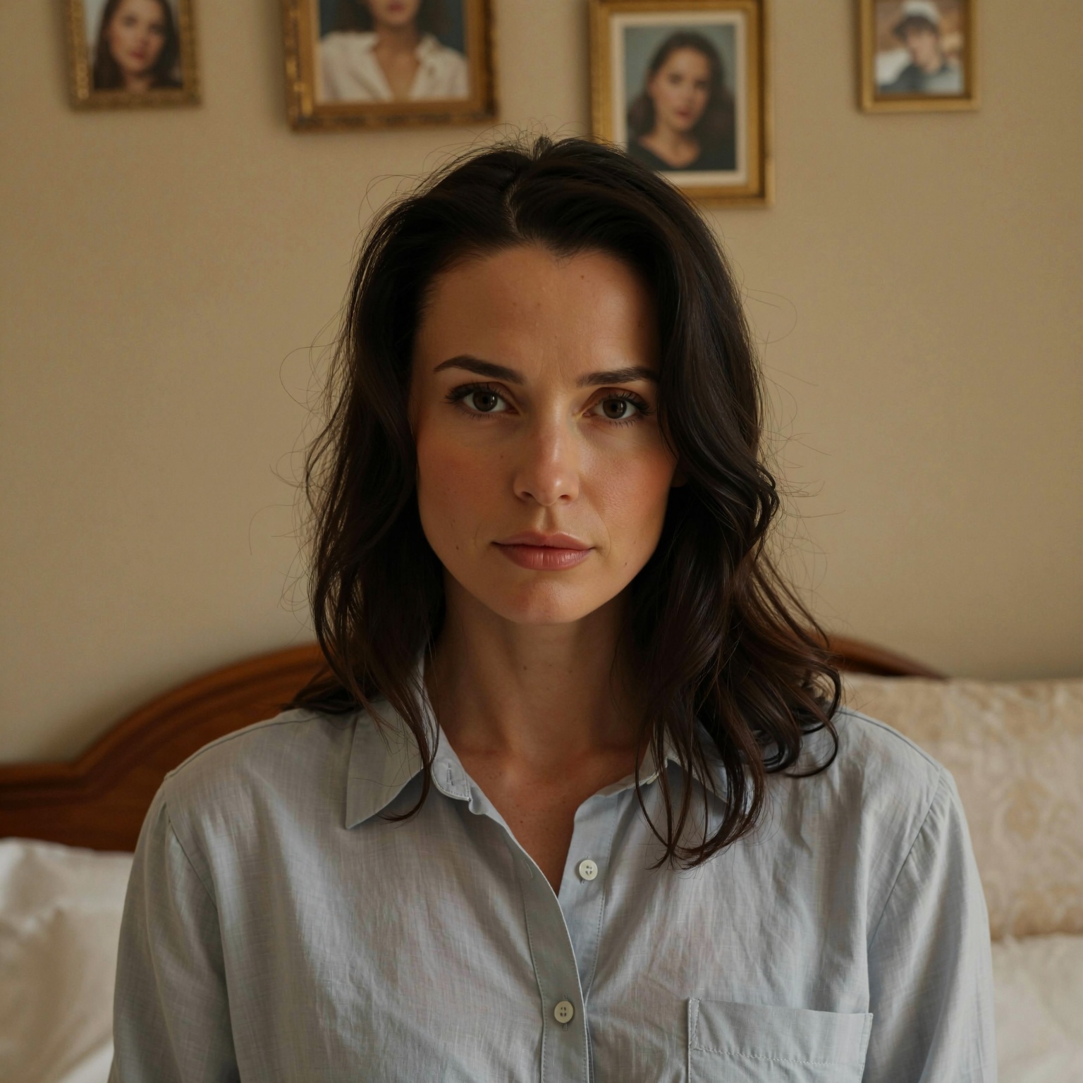 ? Wardrobe: She is wearing a collared, long-sleeved button-up shirt. The fabric appears to be a lightweight, natural material like linen or | Enhanced Prompt: A photorealistic medium shot of a Caucasian woman in her late thirties to early forties, possessing a medium build and fair skin with subtle undertones. Her dark brown, shoulder-length, slightly wavy hair frames prominent facial features, including high cheekbones and a strong jawline. She wears a collared, long-sleeved button-up shirt made of lightweight linen. Her expression is serious and contemplative, meeting the viewer’s eye with a direct, unwavering gaze. The scene is an intimate indoor setting; the top of a wooden bed frame is visible in the lower left quadrant, and framed portraits hang on the wall behind her, creating depth. The lighting is soft and diffused, suggesting a large window or studio softbox, creating a warm color tone and smooth, creamy bokeh that isolates the subject. The focus is precisely on her eyes, rendered with high clarity and minimal digital grain, suggesting a 50mm prime lens aesthetic. SHOT: