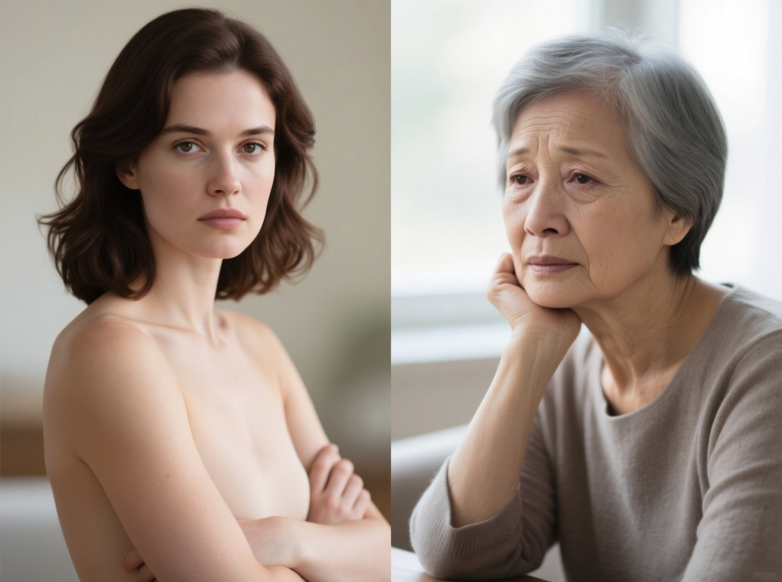 * Older Woman: Appears to be in her late 60s to early 70s, Caucasian with a fair skin tone showing signs of aging like fine wrinkles. She has a slender build, appearing of average to slightly below average height. Her hair is gray, short, and styled neatly. Her facial features are softer, with a prominent brow and a weary or sad expression. Her eyes are | Enhanced Prompt: A medium shot, split composition photograph featuring two women occupying roughly equal halves of the frame, visually divided by a central element.