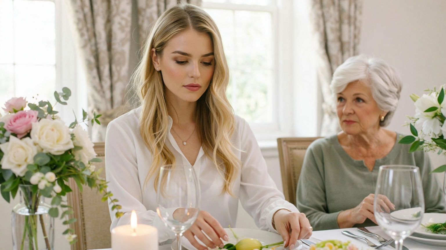 * Older Woman: Appears to be a Caucasian female, likely in her late 60s or 70s. She has a slender build and fair skin with visible wrinkles, consistent with her age. Her hair is short, grey, and | Enhanced Prompt: A photorealistic medium shot capturing the upper bodies of two Caucasian women seated intimately at a finely set dining table. The younger woman, in her early twenties with a slender build and long, wavy blonde hair, is positioned in the foreground, slightly left of center, looking downward with a focused, introspective expression at her hands resting near a centerpiece floral arrangement. The older woman, likely in her late sixties with short, neat grey hair, is seated in the background to the right, rendered with a soft, pleasing bokeh effect. The scene is illuminated by bright, natural daylight supplemented by warm indoor light, creating a clean, high-clarity aesthetic with very low digital noise. A moderate telephoto lens perspective maintains a natural look, emphasizing the sharp focus on the foreground subject’s delicate features and the smooth, gradual falloff of depth of field toward the background elements. Symmetrical composition is avoided in favor of an asymmetrical balance, focusing attention inward. SHOT:
