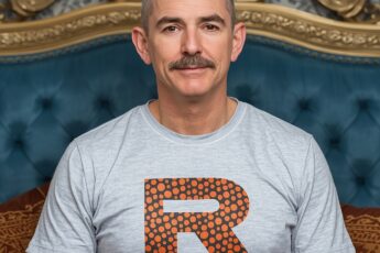 * Man: Appears to be a Caucasian male, estimated age range of 40-50 years. He has a large, muscular build, with a broad chest and shoulders. His face is round, with a wide, hearty laugh. His skin tone is fair, with some redness. His hair is short, shaved on the sides and longer on top, with a light brown color. He has a