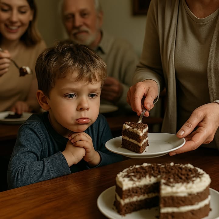 Лиза сидела, подперев щёку рукой. В комнате было шумно, жарко. Она смотрела, как другие дети едят: крошки на щеках, крем на пальцах. Рядом с ней стояла пустая тарелка.