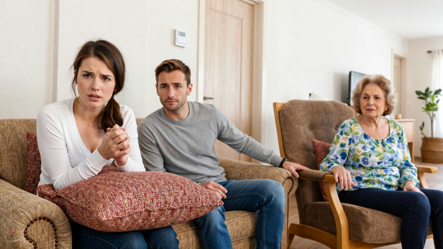 * Middle Subject (Male): Appears to be a young adult, estimated age 20-28. Caucasian ethnicity. Average build, slightly athletic impression. Fair skin tone. Light brown hair, short, styled neatly. His facial features are regular. His expression is serious and concerned, looking slightly off-camera | Enhanced Prompt: A photorealistic medium shot capturing three individuals seated in an intimate indoor setting: a young adult female (18-25, slim, fair skin, shoulder-length brown hair in a low ponytail) displaying a tense, worried expression with clasped hands, positioned on the left couch cushion; a young adult male (20-28, average build, light brown short hair) seated beside her, looking serious and concerned slightly off-camera; and an elderly woman occupying the right armchair, anchoring the frame. The composition is slightly asymmetrical, weighted toward the left subjects. The scene is illuminated by ambient indoor light, suggesting a moderate ISO and shutter speed for clarity, resulting in sharp details on the subjects’ faces and clothing, with minimal digital noise. A moderate focal length lens creates a shallow depth of field with creamy, smooth bokeh, cleanly separating the focused figures from the softly blurred background environment. SHOT: