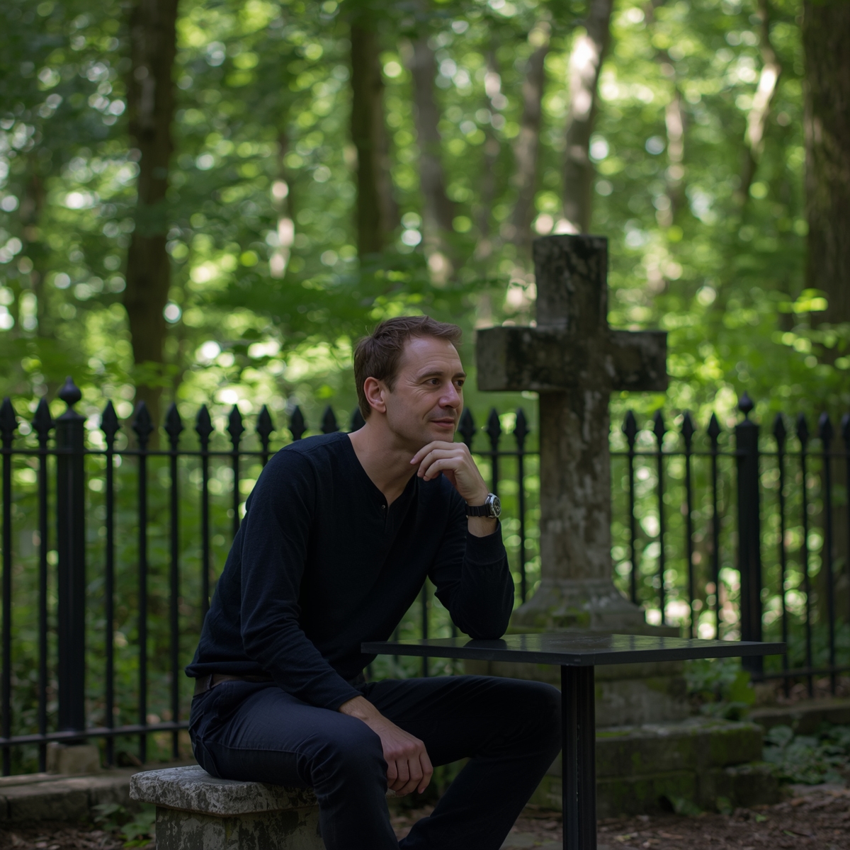 Василий продолжил путь к кладбищу, обдумывая, что там, наверное, будет тихо. Пройдя через ограду, он огляделся — всё ли в порядке, — и опустился на скамейку.