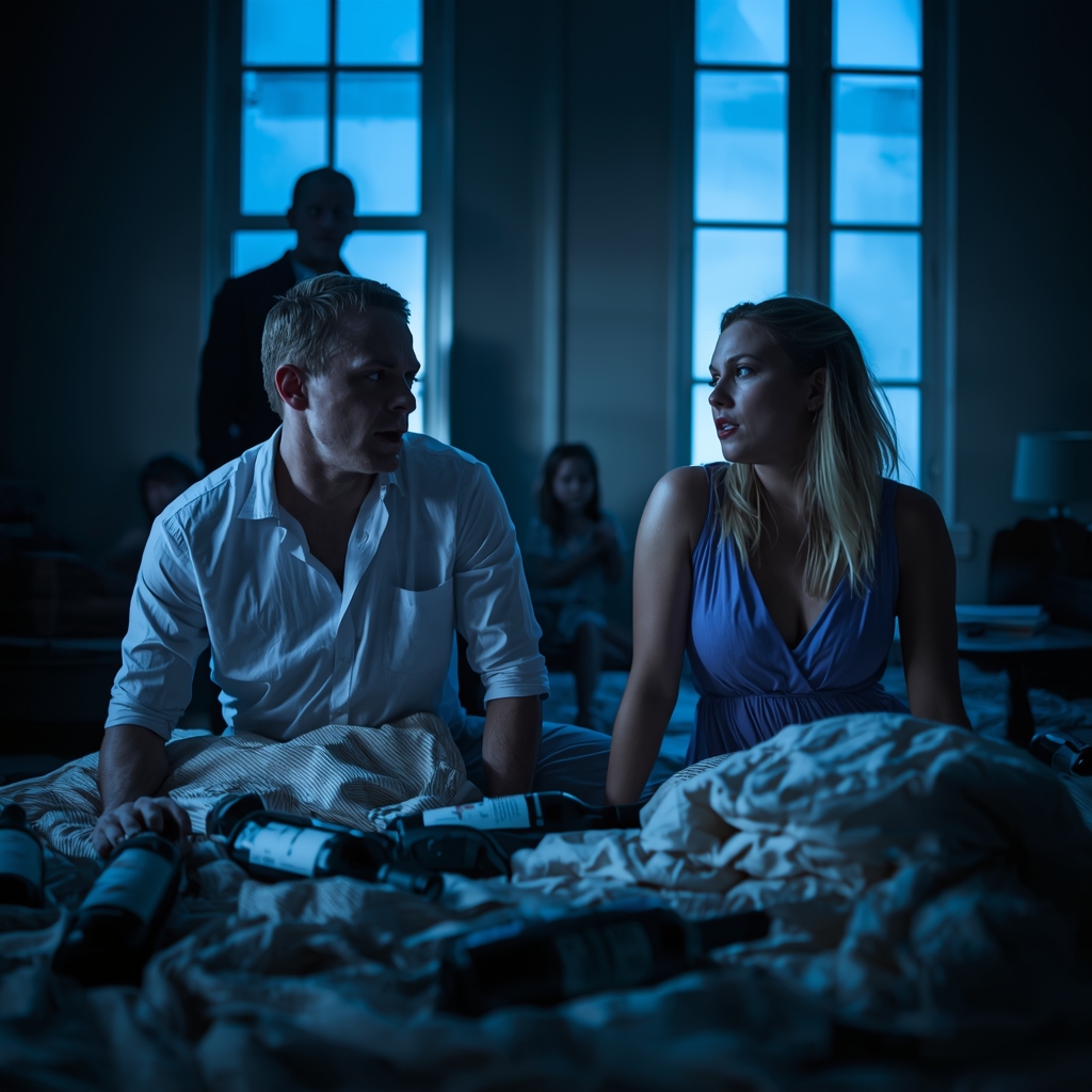 Сняв тяжёлые ботинки, Сергей прошёл в коридор. Звуки становились громче, и теперь он различил голоса — один был женский, другой мужской. Его брови сошлись на переносице, и он ускорил шаг, направляясь к спальне. Дверь была приоткрыта, и то, что он увидел, заставило его застыть на месте. Катя, его жена, лежала на их кровати в объятиях незнакомца — молодого парня с татуировками на руках, чьё лицо было ему смутно знакомо. Постельное бельё было смято, на полу валялась бутылка вина, а рядом — мужские джинсы и её любимая шелковая пижама.