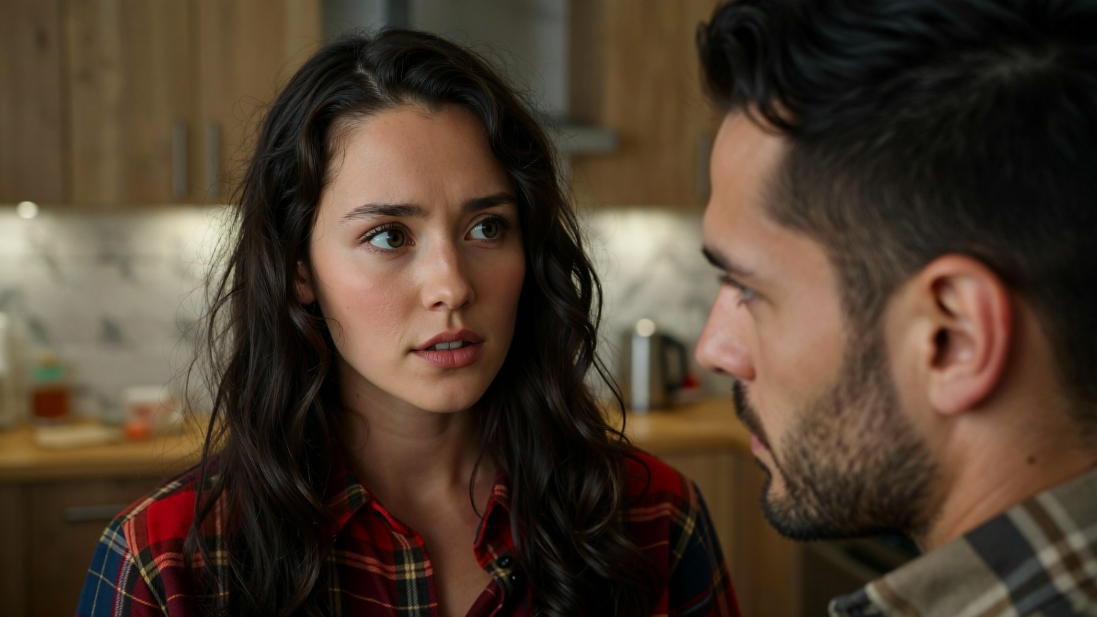 ? Wardrobe: The woman is wearing a long-sleeved collared shirt with a plaid pattern in shades of red, blue, and brown. The fit appears casual. The man is | Enhanced Prompt: A photorealistic medium shot, tightly framed on the faces of a young adult female, early twenties, with fair skin, long wavy dark brown hair, and wide light-colored eyes showing concern, and a young adult male, mid-twenties, seen in profile with dark hair and a beard, looking seriously toward her. The woman, positioned slightly left of center, wears a casual red, blue, and brown plaid collared shirt. The composition is intentionally asymmetrical, creating visual tension as they gaze intently at each other. The scene is an indoor setting, likely a kitchen, with the background softly blurred into creamy bokeh shapes, isolating the subjects. The lighting is clean and sharp, suggesting a prime 85mm lens at f/2.8, emphasizing sharp focus on the woman’s features with a natural perspective. Hyperrealistic, high detail, cinematic portrait. SHOT: