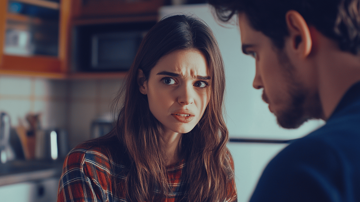 ? Wardrobe: The woman is wearing a long-sleeved collared shirt with a plaid pattern in shades of red, blue, and brown. The fit appears casual. The man is | Enhanced Prompt: A photorealistic medium shot, tightly framed on the faces of a young adult female, early twenties, with fair skin, long wavy dark brown hair, and wide light-colored eyes showing concern, and a young adult male, mid-twenties, seen in profile with dark hair and a beard, looking seriously toward her. The woman, positioned slightly left of center, wears a casual red, blue, and brown plaid collared shirt. The composition is intentionally asymmetrical, creating visual tension as they gaze intently at each other. The scene is an indoor setting, likely a kitchen, with the background softly blurred into creamy bokeh shapes, isolating the subjects. The lighting is clean and sharp, suggesting a prime 85mm lens at f/2.8, emphasizing sharp focus on the woman’s features with a natural perspective. Hyperrealistic, high detail, cinematic portrait. SHOT: