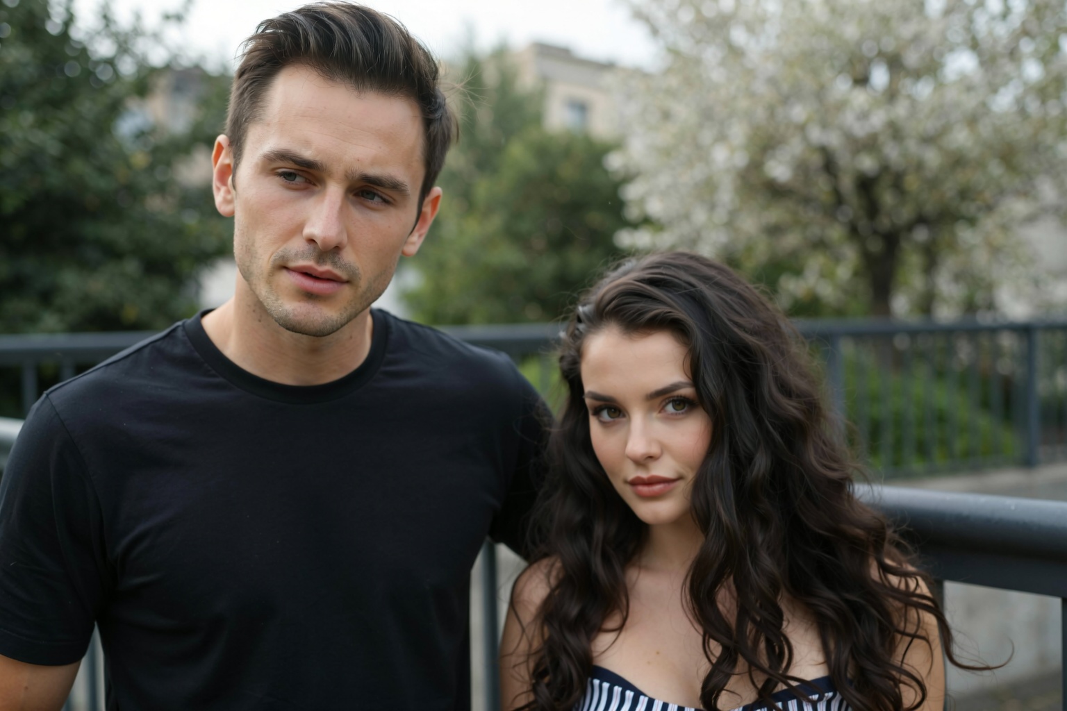 * Female: Appears to be a young adult female, estimated age 20-30. Caucasian ethnicity. Slim to medium build, average height impression. Fair skin tone. Long, wavy dark brown hair styled with volume, falling over her shoulders. Her facial features are delicate, with high cheekbones and expressive eyes. Her | Enhanced Prompt: A photorealistic medium shot capturing two young adults, a serious young man aged 25-35 with short brown hair and a strong jawline looking slightly down and left, positioned on the left, and a delicate young woman aged 20-30 with long, voluminous dark brown wavy hair positioned on the right, their upper torsos framed. Both subjects have fair skin and are sharply focused in the foreground against a softly blurred background of indistinct foliage and a railing, achieved with a shallow depth of field (f/2.8 aesthetic). The lighting is clean, diffused natural light suggesting an overcast day, resulting in smooth textures and minimal noise. The composition is slightly off-center, utilizing a moderate focal length lens for pleasing subject isolation and creamy bokeh. Super realistic, high detail, clean digital capture. SHOT: