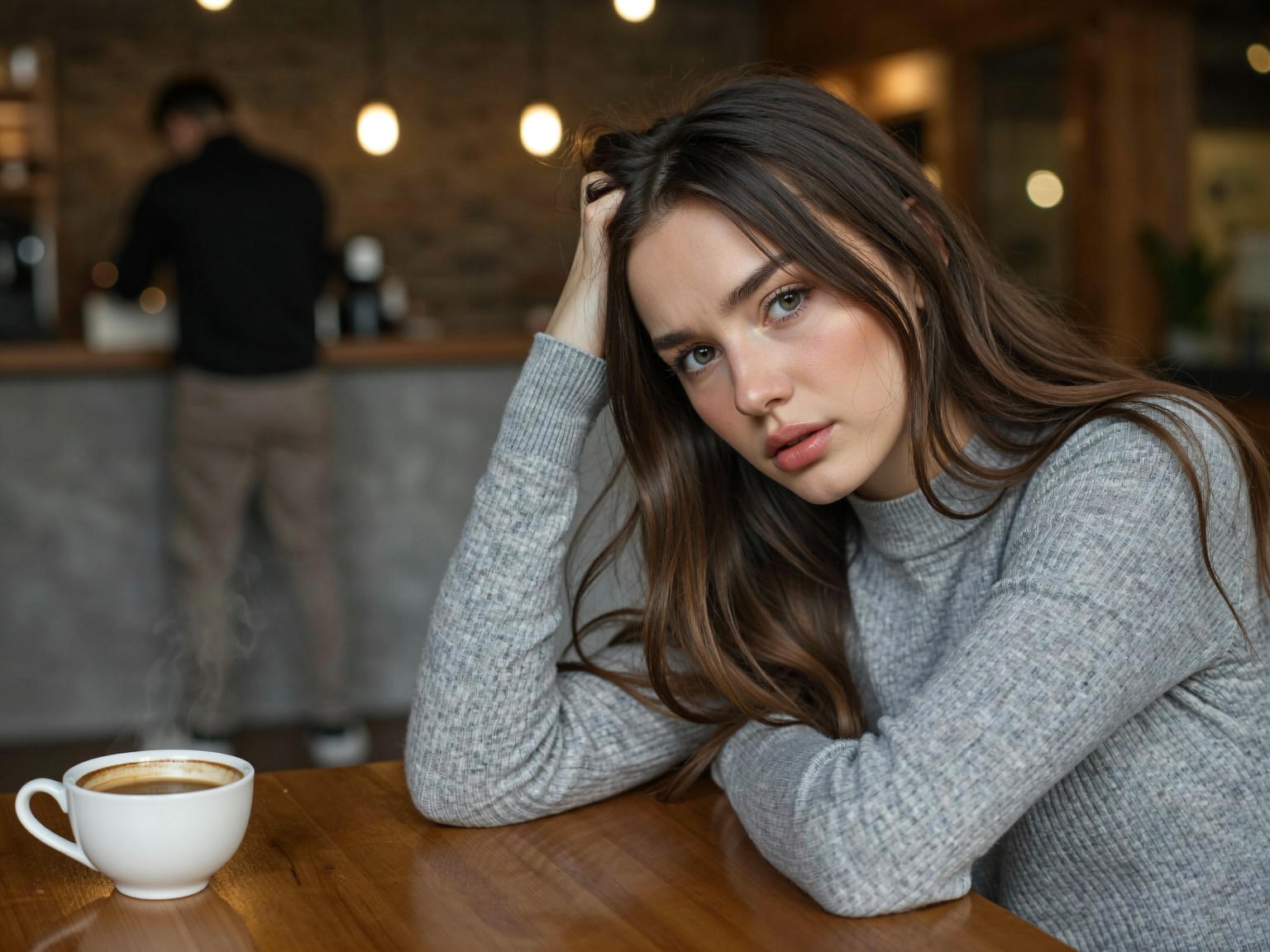 • Composition: Medium shot, subject positioned slightly off-center to the right, adhering to the rule of thirds. Her gaze is directed towards the viewer, creating a direct emotional connection. The background figure is blurred and positioned to the left, creating a visual imbalance that emphasizes the foreground subject’s isolation. The table and coffee cup act as foreground elements, leading the eye towards the subject.