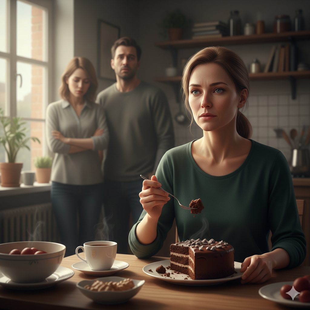 Мария снова вернулась на кухню и с удовольствием слушала крики, раздававшиеся из соседней комнаты. Когда крики стихли, Мария отрезала себе большой кусок торта.
