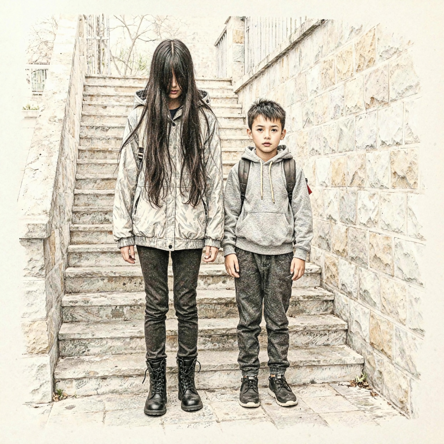 • Description: Two children, appearing to be between 8 and 12 years old. The child on the left is taller, with very long, straight, dark hair that obscures their face. Their build appears slender. The child on the right is slightly shorter, with short, dark hair. They have a more defined facial profile visible, with a neutral to slightly concerned expression. Their build also appears slender.