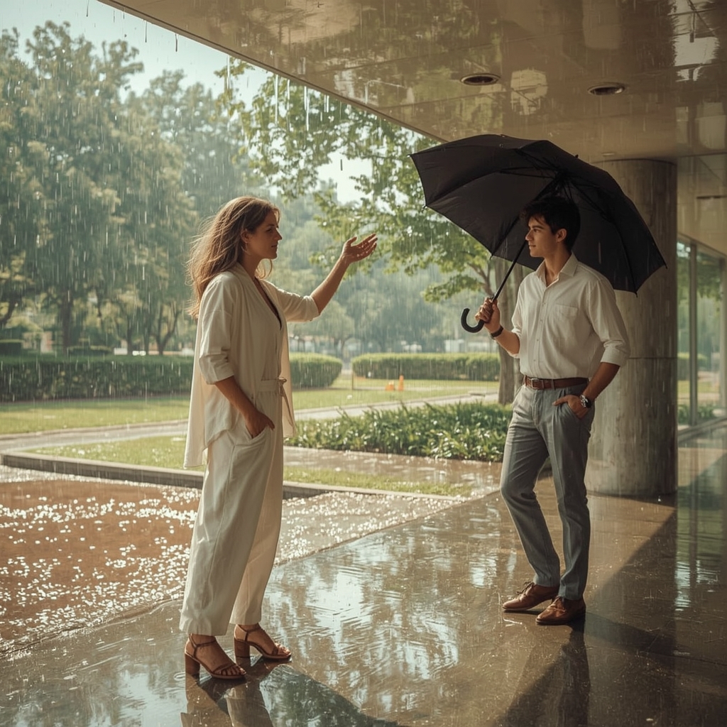 — Девушка, держите мой зонтик, — сказал вдруг молодой человек, стоящий недалеко от неё.