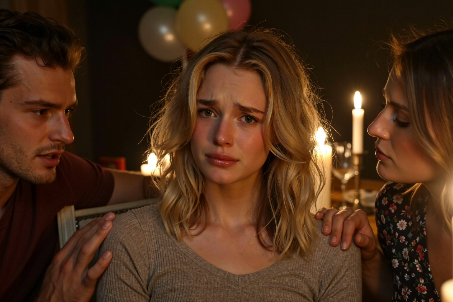 * Man on Left: A | Enhanced Prompt: A hyperrealistic medium shot focusing on three individuals seated intimately around a warmly lit table, adhering to the rule of thirds with the central subject positioned slightly off-center to the left. The central subject is a young adult female, late teens/early twenties, with fair skin, a slightly flushed complexion, delicate features, a prominent nose, and full lips; her shoulder-length, tousled blonde hair is side-parted, and her expression conveys deep distress and sadness with furrowed brows and downcast eyes. The man on the left leans in close, his arm resting on the back of her chair, while the woman on the right places a comforting hand on her shoulder, forming a powerful triangular composition. The scene is illuminated by the warm glow of candlelight and soft ambient room light, suggesting an aperture of f/2.8 to f/4, creating a moderate, creamy bokeh where out-of-focus elements like soft balloons and flickering candles blur beautifully. A moderate focal length (50-85mm) ensures natural perspective, rendering sharp textures on the subjects against a softly atmospheric background, emphasizing the emotional core of the scene with clean digital clarity. SHOT: