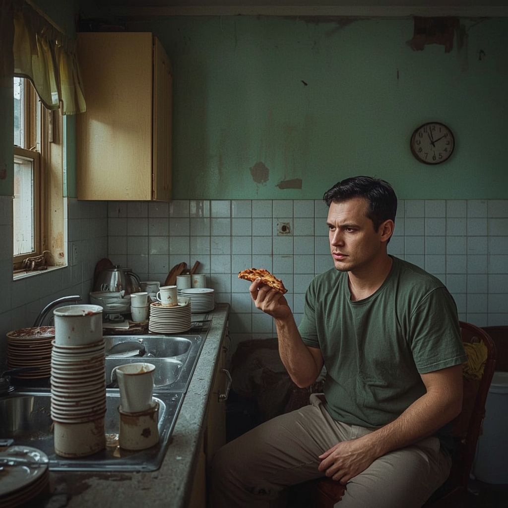 Он покосился на гору тарелок в раковине и со вздохом откусил кусок резиновой пиццы.