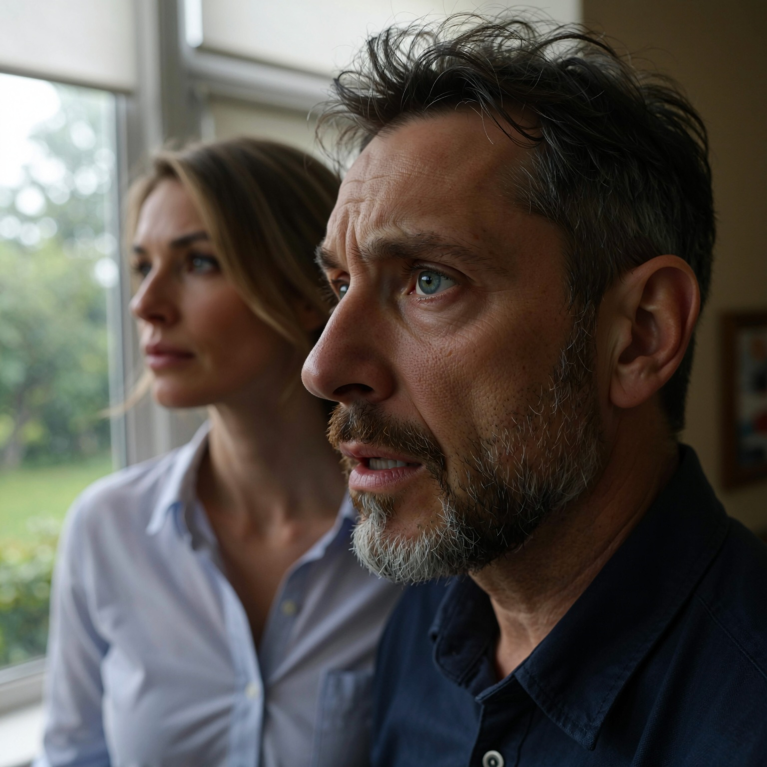 ? Description: The primary subject is a Caucasian male, appearing to be in his late 50s to early 60s. He has a medium build and appears to be of average height. His skin tone is fair with visible wrinkles and age lines, particularly on his forehead and around his eyes. He has short, graying brown hair, styled neatly with some volume. His facial features include a prominent nose, a thick, graying mustache and beard, and deep-set blue or hazel eyes. His expression is one of concern, worry, or deep thought, with furrowed brows and a slightly downturned mouth. The secondary subject is a Caucasian female, appearing to be in her late 30s to early 40s. She has a slender build and appears to be of average height. Her skin tone is | Enhanced Prompt: A photorealistic medium shot, tightly framed on the faces of two individuals, emphasizing the male subject dominating the foreground, slightly off-center to the right, with a concerned expression, furrowed brows, and a slightly downturned mouth. This Caucasian male, late 50s, has fair skin, deep-set blue/hazel eyes, short graying brown hair, and a thick graying mustache and beard. The secondary subject, a slender Caucasian female in her late 30s, is positioned to the left and slightly behind, rendered softly out of focus. The scene is illuminated by soft, diffused natural light from a window to the left, suggesting low ISO clarity with very fine digital grain. The aesthetic utilizes a shallow depth of field (f/2.8 to f/4), resulting in creamy, smooth bokeh that isolates the male subject, whose features are in sharp focus. The composition is intentionally asymmetrical, focusing entirely on the foreground subject’s deep thought. Hyperrealistic, portrait. SHOT: