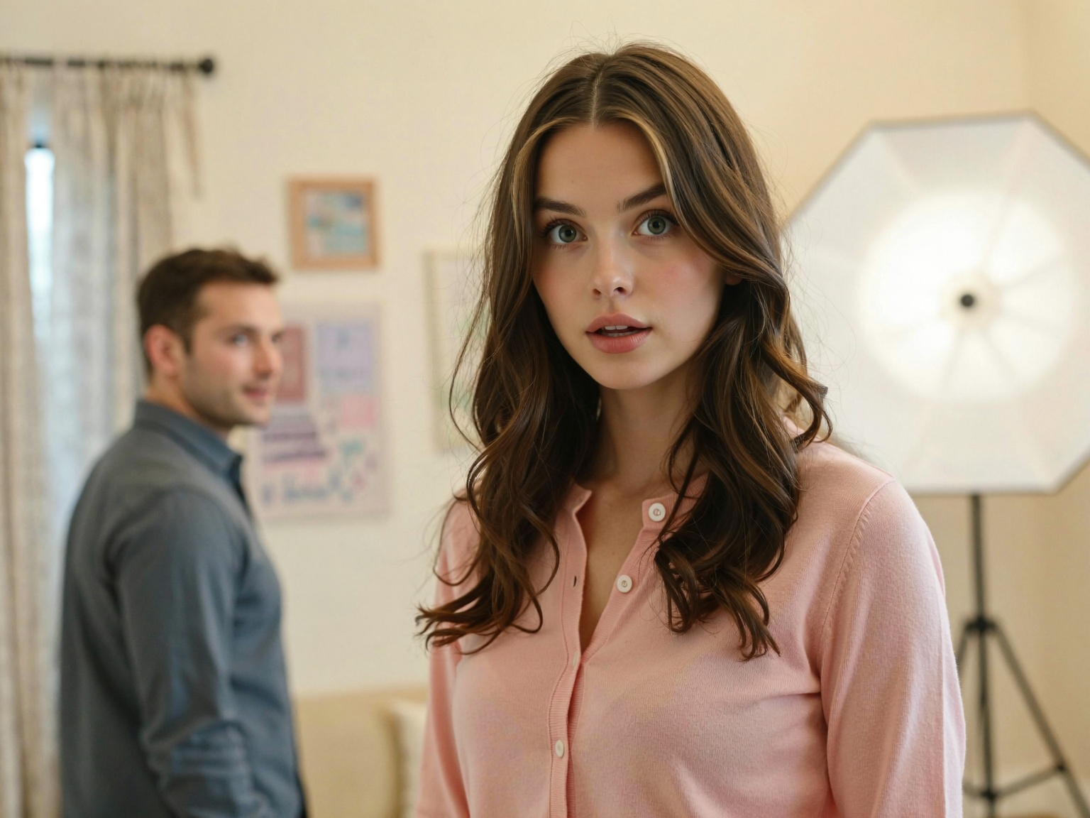 ? Grooming: Her makeup is natural and subtle, emphasizing her eyes and lips. Her eyebrows are well | Enhanced Prompt: A photorealistic medium shot portrait of a young adult female, early to mid-twenties, with a fair complexion and delicate features, including prominent cheekbones and striking blue-green eyes looking directly at the viewer with a subtle expression of surprise. Her medium brown hair is styled in loose waves framing her face. She wears a light pink, soft knit, long-sleeved button-up cardigan with a relaxed fit. The scene is softly lit by diffused light, mimicking a large softbox, creating a warm color tone and smooth, creamy bokeh in the background where a softly blurred male figure and indistinct elements provide context. The composition adheres to the rule of thirds, slightly off-center to the right, with sharp focus on her face and a gradual, pleasing depth of field falloff. Minimal film grain, high digital clarity, 85mm lens aesthetic. SHOT: