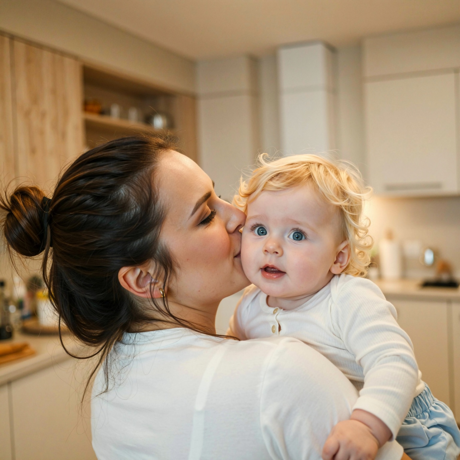 ? Description: The woman appears to be a young adult, likely in her early to mid-twenties, with a fair complexion. She has dark brown hair pulled back into a neat bun at the top of her head, with some wisps framing her face. Her facial features are delicate, and she is shown in profile, kissing the baby on the cheek. Her eyes are closed. The baby appears to be around 12-18 months old, with fair skin and light blonde, slightly wavy hair. The baby has large, curious blue eyes and a round face. The baby’s expression is one | Enhanced Prompt: A photorealistic medium shot capturing a young woman in her early twenties, fair-skinned with dark brown hair neatly pulled into a bun, shown in profile kissing the cheek of a 12-18 month old baby held in her arms. The baby has fair skin, light blonde wavy hair, and large, curious blue eyes, looking directly at the viewer with an engaged expression. The woman’s eyes are closed in a tender moment. They are positioned slightly left of center, balanced by the soft, blurred elements of a warm, modern kitchen environment in the background. The scene is illuminated by soft, warm artificial light mixed with ambient natural light, suggesting a moderate ISO capture with minimal grain. The focus is critically sharp on the baby’s face, utilizing a shallow depth of field (f/2.8 aesthetic) to create a pleasing bokeh effect isolating the subjects against the clean, detailed background. SHOT: