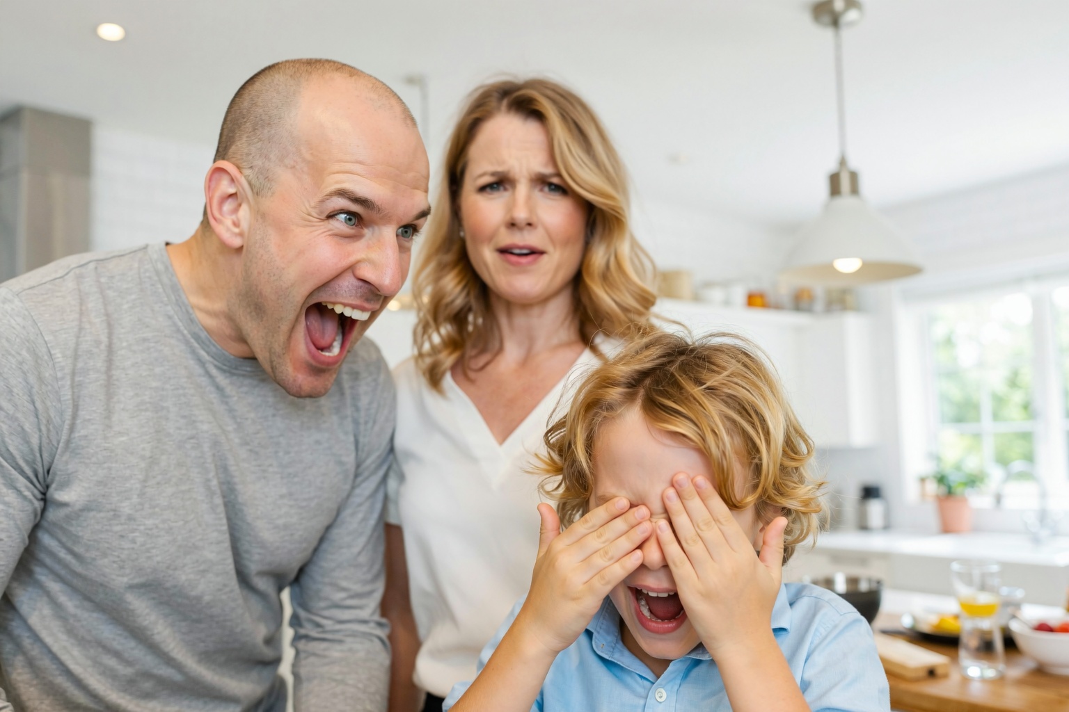 * Son: Appears to be a Caucasian male, likely between 4-6 years old. Slim build. Blond hair, short and slightly messy. His hands are covering his | Enhanced Prompt: A photorealistic medium shot capturing the upper bodies of three family members in a dynamic yet balanced composition within a brightly lit kitchen environment. The father, a Caucasian male in his late 30s with a shaved head, is on the left, his mouth wide open in a shout or hearty laugh, creating a strong visual anchor. The young son, a Caucasian male aged 4-6 with messy blond hair, is in the foreground, slightly right of center, his small hands covering his face in reaction, and his face is in the sharpest focus. The mother, a Caucasian female in her late 30s with light auburn, wavy shoulder-length hair, stands behind and to the right of the father, looking toward the son with an expression mixing concern and amusement. The lighting is bright, suggesting overhead kitchen fixtures and ambient window light, resulting in high digital clarity with smooth gradients and virtually no film grain. A standard focal length lens provides natural perspective, with a moderate depth of field (f/4 equivalent) that keeps the son sharp while subtly softening the parents and the background kitchen elements. SHOT: