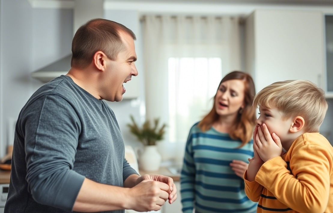 ? Composition: Medium shot, capturing the upper bodies of three individuals. The father is positioned on the left, slightly angled towards the center. The son is in the foreground, right of center, facing slightly away from the father. The mother is in the background, behind and to the right of the father, looking towards the son. The composition is balanced but dynamic, with the father’s open mouth and hands creating a strong visual anchor.