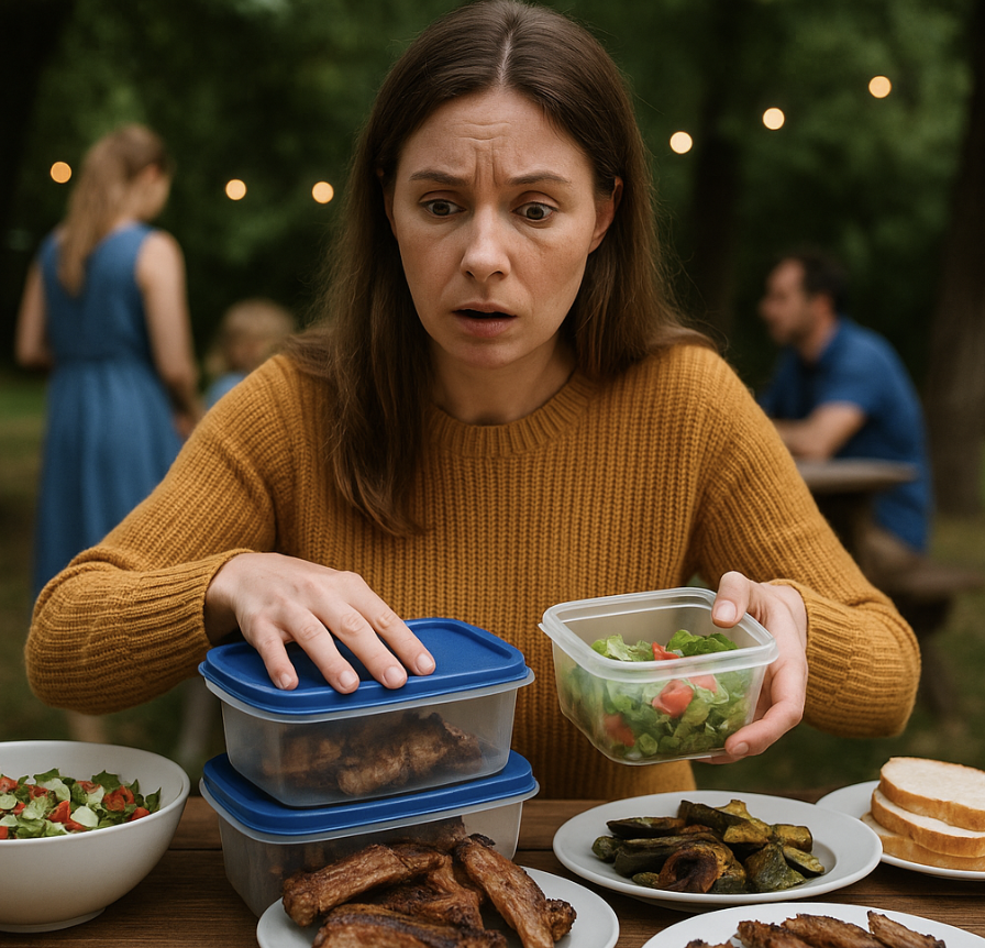 Себе я тоже отложила немного барбекю — просто чтобы не готовить на следующий день. На даче мы не ночевали, планировали уезжать вечером. Упаковывала судочки заранее: два с мясом, один с салатом. Всё аккуратно подписано, отставлено в сторону.