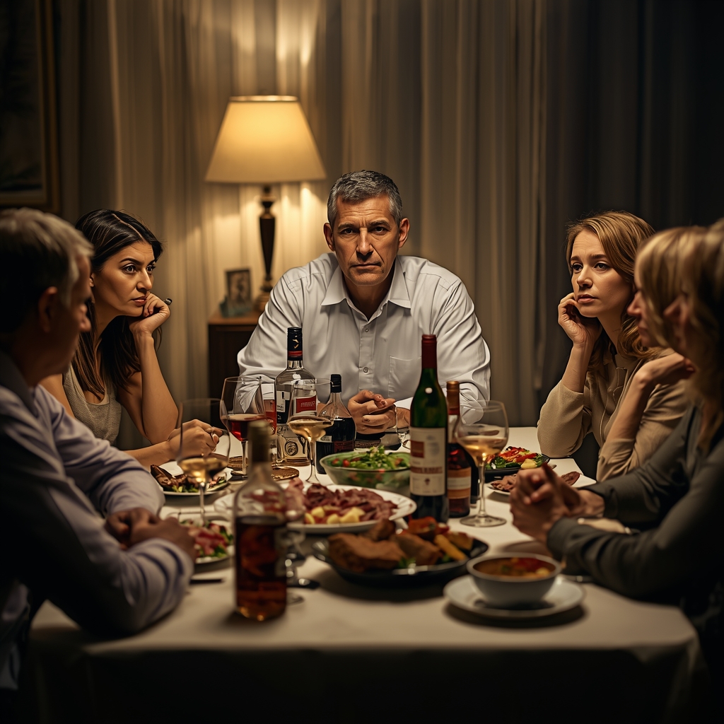 Он курсировал между столом и кухней, потея, роняя вилки и путаясь в собственных ногах. Великолепный хозяин превратился в суетливого, жалкого неумеху, не способного даже подать хлеб. Гости сидели молча, опустив глаза.