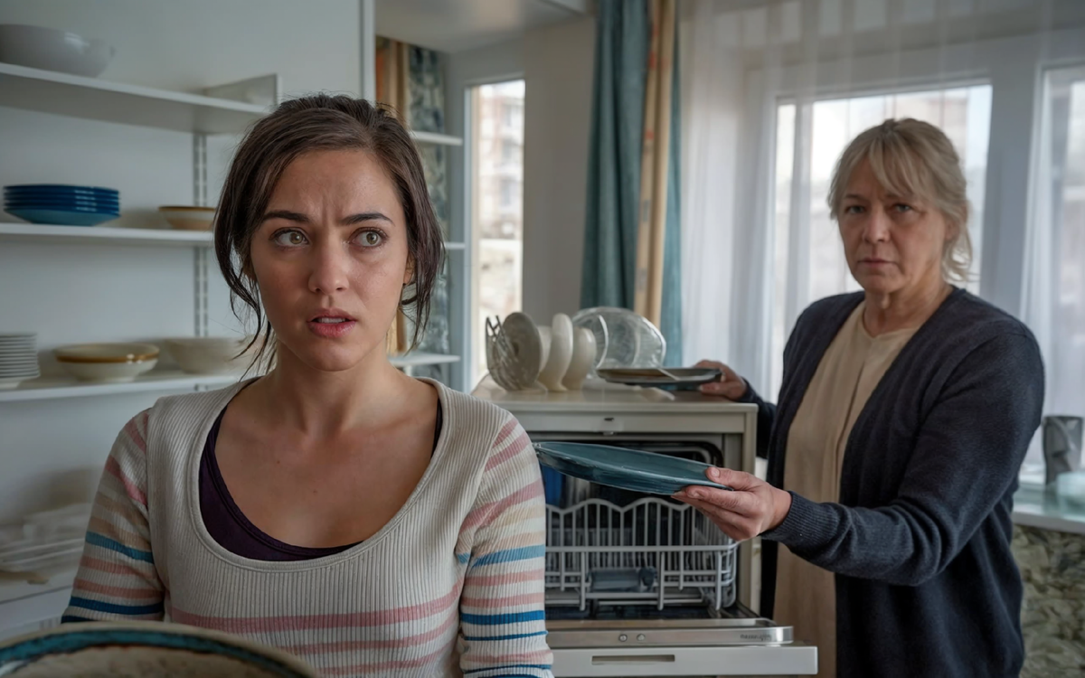 Свекровь наблюдала, как невестка загружает в машину тарелки, чашки и столовые приборы.